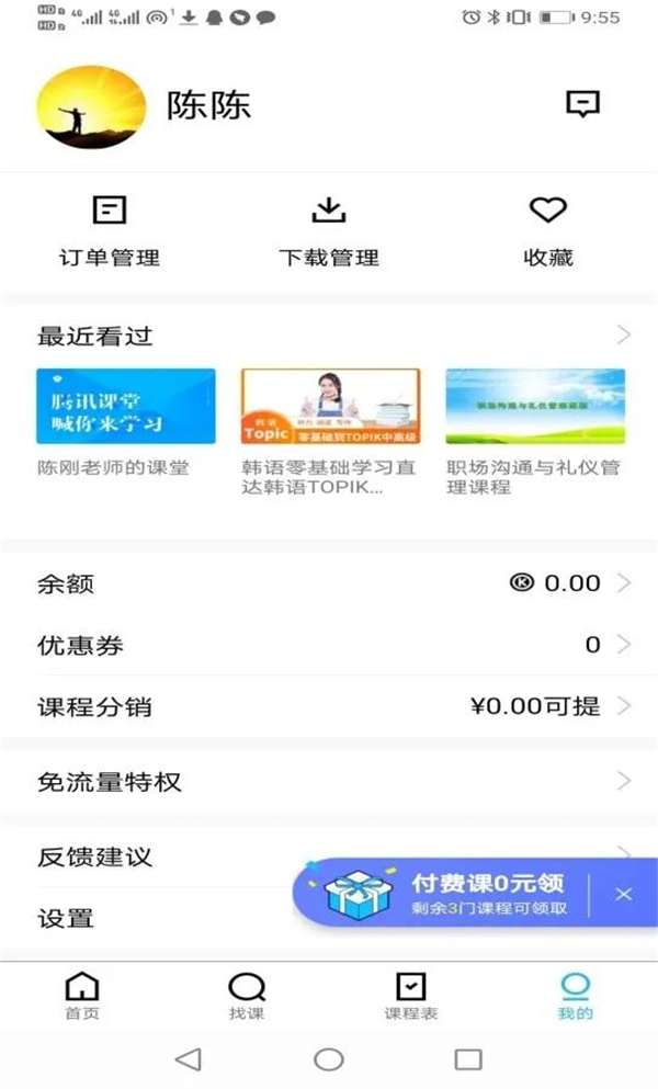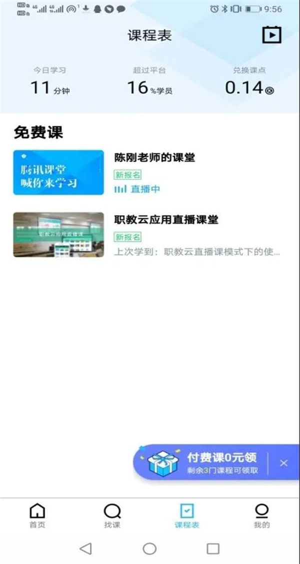 3.直接进入App。学生直接进入APP,点击界面“课程表”,系统会自动显示教师开课情况,点击即可,界面如图6。对已经学习过的课程,还可以点击界面下发“我的”,观看“最近看过”的课堂视频,界面如图7。