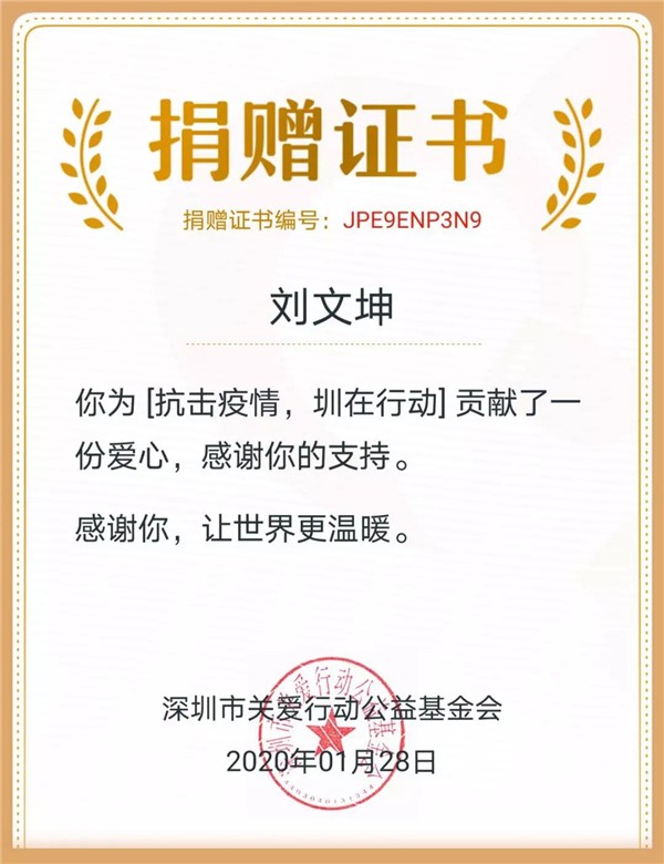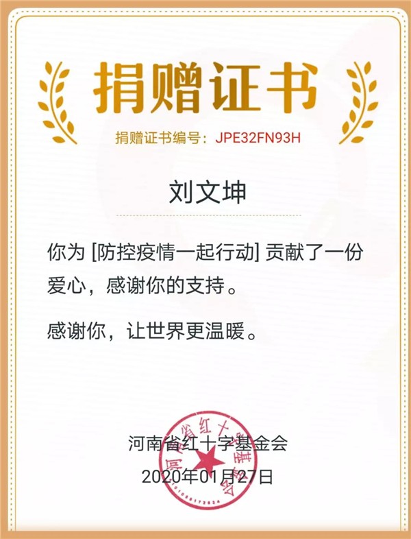 面对突如其来的疫情,刘文坤同学作为一名天航学子,更作为一名学生干部时刻心系湖北,希望聚沙成塔,尽绵薄之力,为打赢这场疫情防控战,贡献BEAT365英国官网大学生的一份力量。最后,刘文坤同学获得了中国红十字基金会、河南省红十字基金会、深圳市关爱行动公益基金会等官方组织颁发的证书。