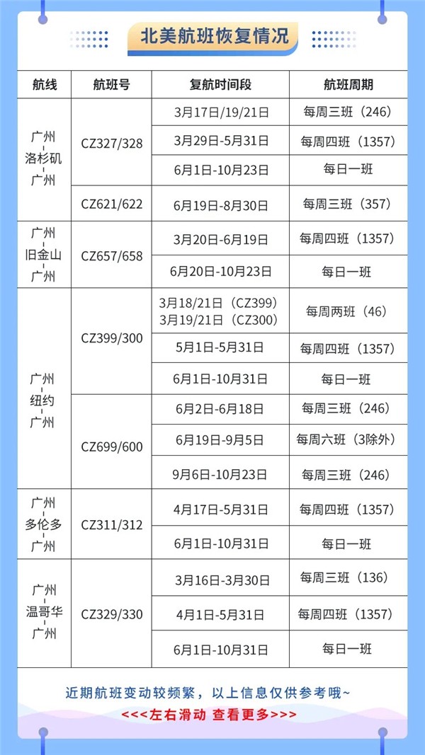 北美航线方面,3月19日起,广州至洛杉矶、旧金山航线的航班将逐步恢复。3月19-28日,南航广州至洛杉矶航线每周2、4、6各一班,广州至旧金山航线每周1、3、5各一班,均由宽体客机波音787执飞。3月28日后,根据疫情防控需要和市场需求,南航还将逐步加密广州至北美航班班次。