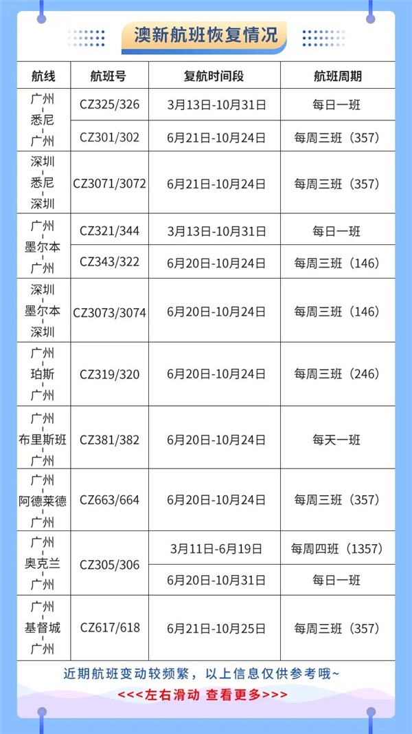 其中,澳新航线方面,3月13日,针对澳新航线的市场需求,南航率先恢复广州至澳新地区航班,其中CZ325/326(广州-悉尼往返)、CZ321/344(广州-墨尔本往返)每日一班,CZ305/306(广州-奥克兰往返)每周四班。根据疫情防控需要和市场需求,南航计划6月起逐步恢复广州至珀斯、布里斯班、阿德莱德、基督城以及深圳至悉尼、墨尔本等航线的航班,加密广州至悉尼、墨尔本、奥克兰航班。