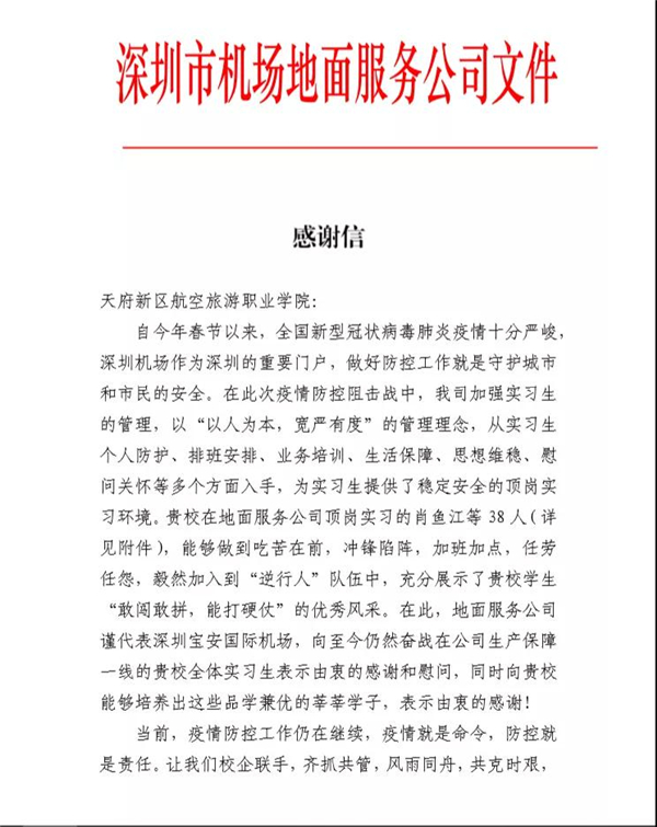 近日,我院收到了一封来自深圳市机场地面服务公司的感谢信,信中说,深圳机场作为深圳的重要门户,做好防控工作就是守护城市和市民的安全。在此次疫情防控阻击战中,贵校在地面服务公司顶岗实习的肖鱼江等38人,冲锋陷阵,加班加点,任劳任怨,毅然加入到“逆行人”队伍中,充分展示了贵校学生“敢闯敢拼,能打硬仗”的优秀风采。