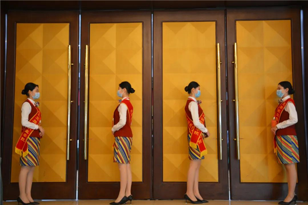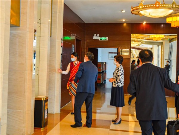 会议进行中各位同学做到了稳重、大方、敏捷、及时。贵宾休息室外的准空姐,时刻保持标准站姿,虽戴着口罩,但依然面带笑容,迎接每一位领导的到来!