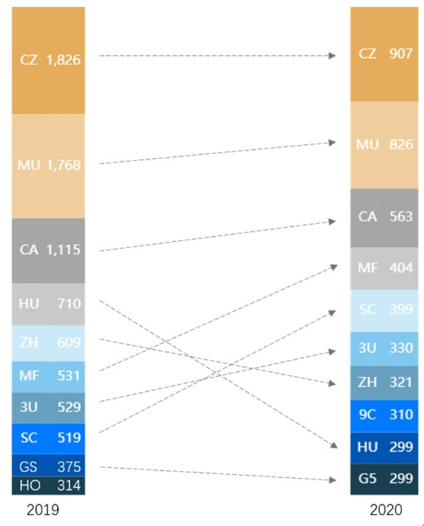 图:8.2019和2020年“五一”期间日均航班量排名前10航空公司对比 数据源:飞常准