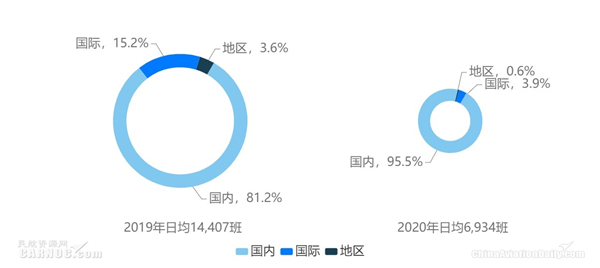 日均航班量的变化更能说明该形式,今年“五一”期间日均航班量为6,934班,仅为去年的48.1%。同时,各类型航班占比变化也十分明显。从图2可以看出,受疫情影响,国际及港、澳、台地区出行受到严格限制,因此今年“五一”期间,国际和地区航线上的航班量大幅缩水,分别占总航班量的3.9%和0.6%,较2019年分别减少11.3和3个百分点。