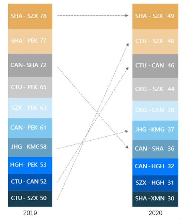 VI.繁忙航线榜单变化较大,同上原因,北京相关机场均未能进入前10位,而成都、重庆相关航线排名上升较大。
