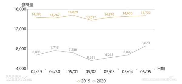 图:2019和2020年“五一”期间航班总量对比 数据源:飞常准