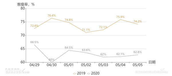 图:2019和2020年“五一”前后客座率变化趋势 数据源:飞常准