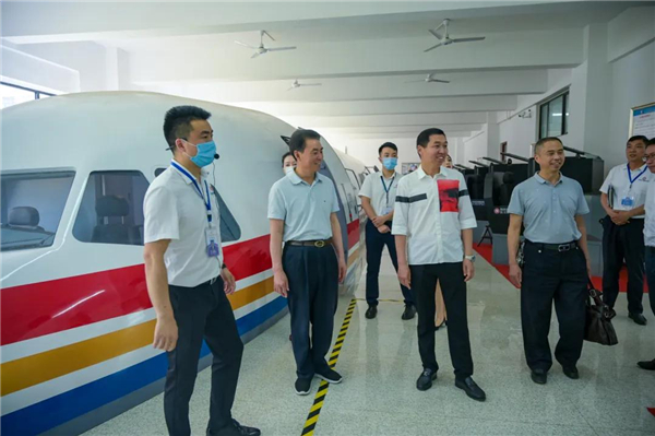 在学院的轨道交通实训室,辜英智向宋思彬一行介绍了模拟动车的每个环节,从高铁购票、安检、上车、运行到下车。随后,坐上校园观光车,辜英智向宋思彬详细介绍了钟楼,体育场,多彩大讲堂等特色建筑。
