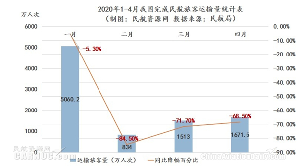 图:2020年1-4月我国完成民航客运量统计表。制图:民航资源网 数据来源:民航局