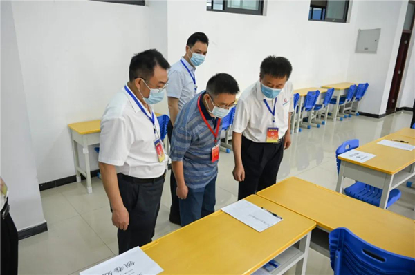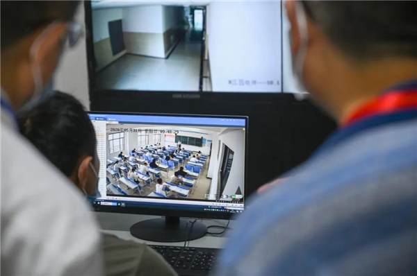 张孝海一行对考生体温检测系统、考场设置、试卷存放保密室、远程监控设备和监考人员配置等进行巡查。从巡考情况来看,天航考点各考室秩序井然,教室环境干净整洁,考生精神面貌较好,全程佩戴口罩,诚信应考,认真答卷。监考老师认真履行监考职责。