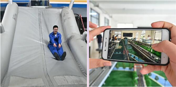 在老师的示范中,同学们学会了规范的逃生动作,掌握了逃生姿势,并进入动态模拟舱切身体验了高空紧急撤离,学习水上迫降后的撤离技能、海上求生技巧等。