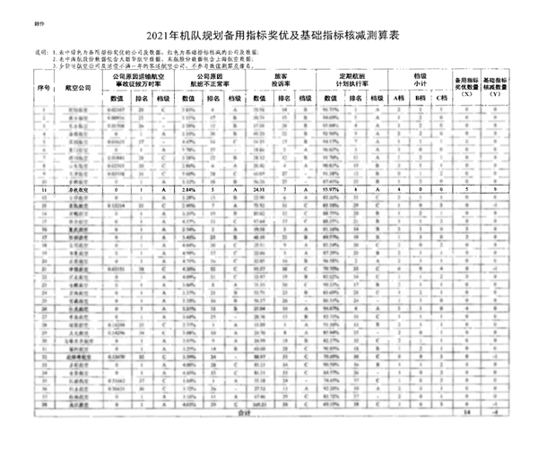 近期,民航局发布《关于运输航空公司2021年机队规划备用指标奖优及基础指标核减数量公示的通知》。这份文件是民航局从安全、航班正常率、旅客投诉率、定期航班计划执行率等四个项目(简称“四率”),对于每家航空公司运行表现进行综合评价,每个项目分别评判ABC。民航局会综合“四率”的完成情况确定每家航司后续机队规划备用指标奖优及基础指标核减数值,通俗来说,如果航司各方面表现都好,民航局会认为运营水平高,达到一定档次,会奖励飞机引进的指标,反之,则会罚减飞机引进的指标。