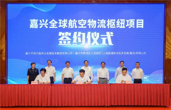 在嘉兴市委书记张兵、圆通蛟龙集团董事长喻渭蛟等人见证下,圆通蛟龙集团副董事长、圆通航空董事长苏秀锋,嘉兴市秀洲区委副书记、区长刘德威,嘉兴市现代服务业发展投资集团党委副书记、总经理姜铭恩分别代表合作三方签约。