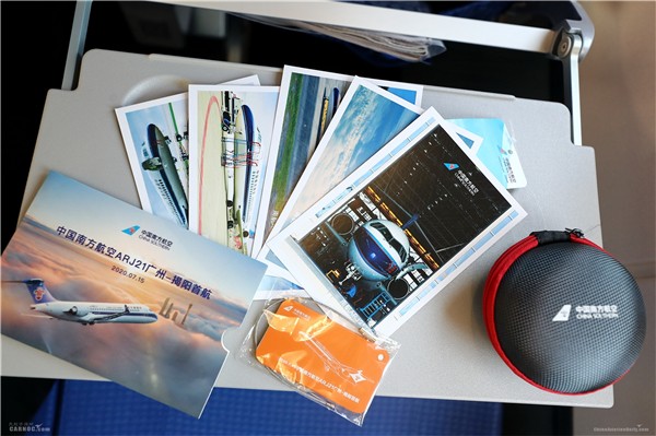 当旅客陆续登机时,乘务员为每位旅客送上一份精美的首航纪念品。起飞前,乘务员还为旅客详细介绍了ARJ21机型的特点和使用说明。