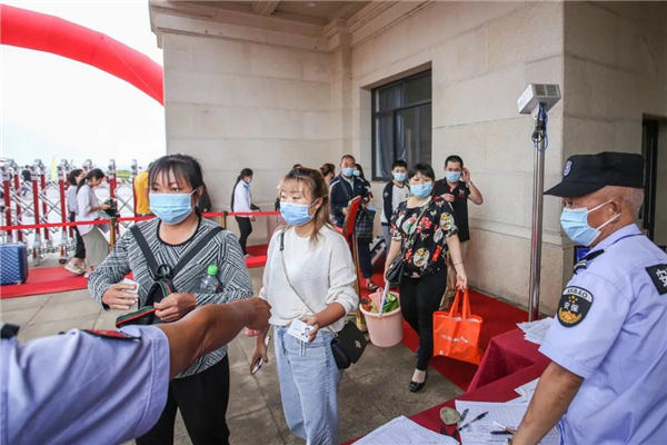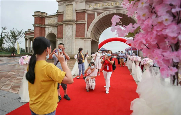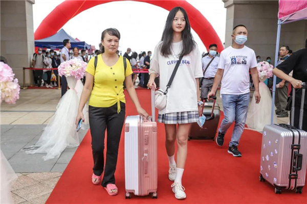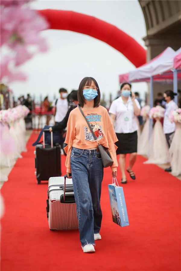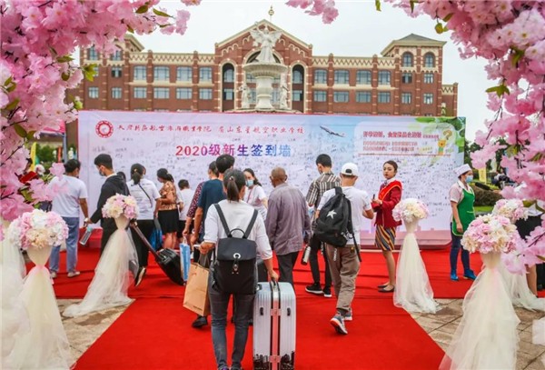 一条近百米长的红色地毯,从校门延伸至的瑞丽广场,两旁的粉红色路引花台和浪漫花朵拱门显得既隆重,又很有仪式感,在签到墙上写上自己的名字,记录进天航的历史里。