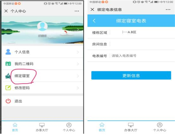 第三步 进入系统以后点击个人中心,绑定寝室先选楼栋信息(6#雄鹰楼、8#金鹏楼、9#飞燕楼、10#孔雀楼),其次楼层,再选区域(ABCD)