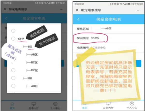 * 请务必确定房间信息正确无误,充值时将只显示电表表号,若要充其他寝室,先解绑原寝室再重新绑定新寝室,否则将只能充已绑定寝室电费!!!
