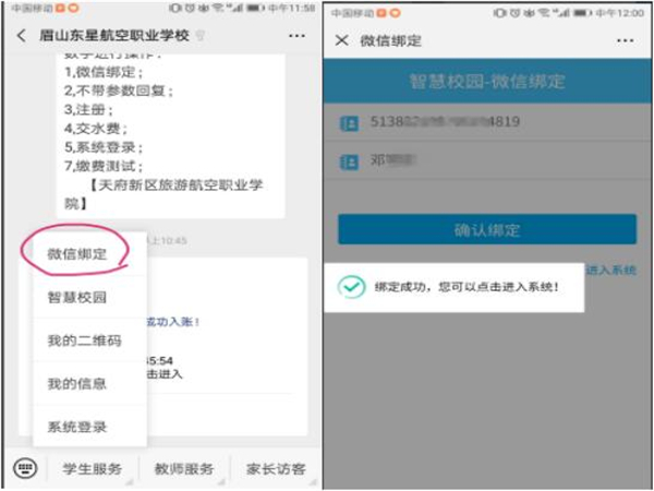第二步 点击学生服务,微信绑定,输入身份证号 姓名,绑定成功进入系统。 (若无法绑定,请到财务处9号窗口处理)