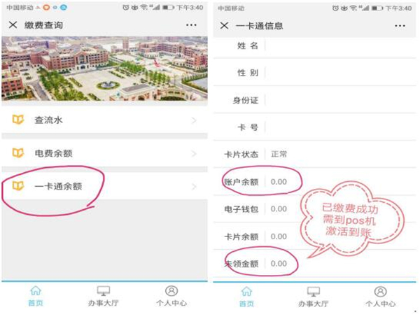 第五步:到寝室楼下圈存机或者到财务处9号窗口的机器激活