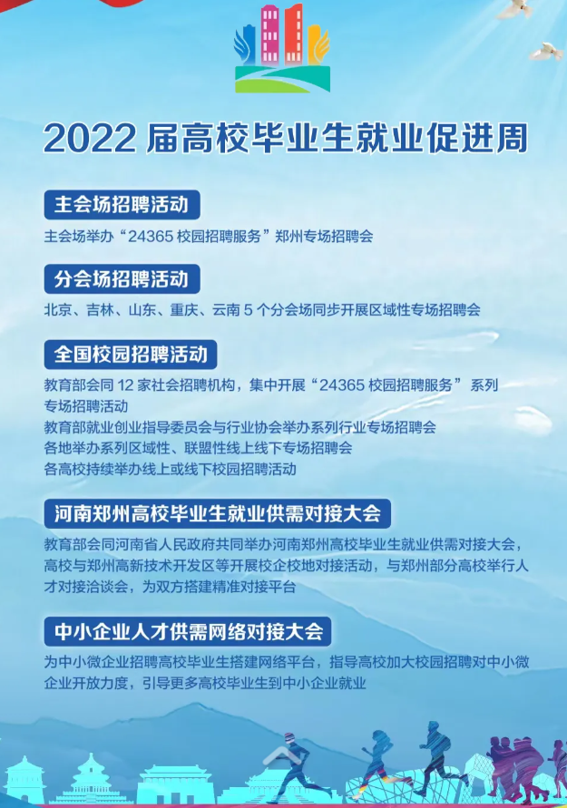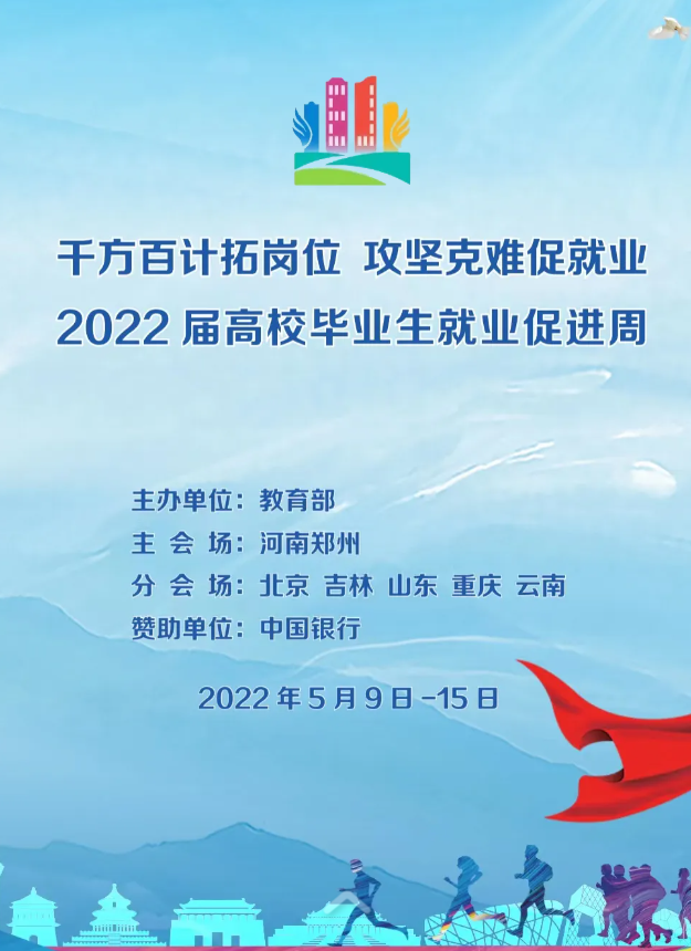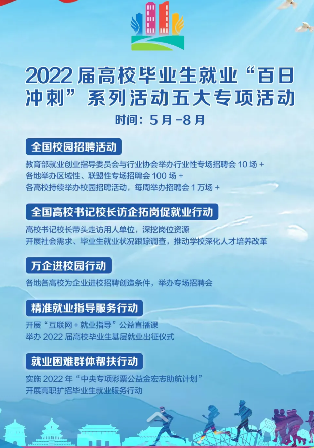 为贯彻落实党中央、国务院“稳就业”“保就业” 决策部署,按照2022年《政府工作报告》落实落细稳就业举措部署要求,抢抓高校毕业生求职关键期,全力促进高校毕业生顺利就业,教育部决定举办2022届高校毕业生就业促进周,开展“百日冲刺”系列活动。https://a.xiumi.us/stage/v5/5WRKU/367515360