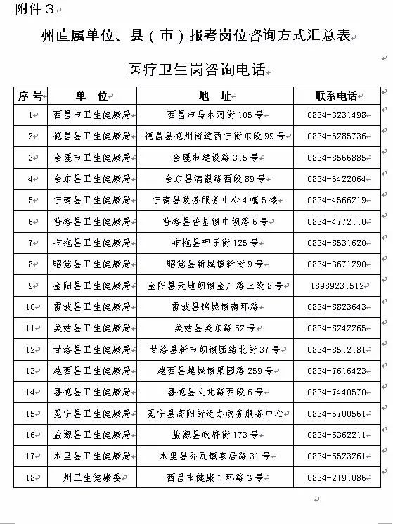 医疗卫生岗咨询电话:凉山州卫生健康委,电话:0834-2191086