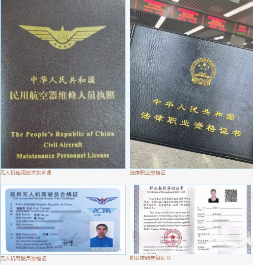民用航空器维修人员执照、机务维修147基础执照、钳工证、电工证、CCAR-147技能培训证书、民用航空器维修基础执照、无人机驾驶员执照、民用无人机系统专业工程师资质、计算机技术与软件技术资格(水平)证书、全国信息化工程师证、数据库系统工程师证、数据库工程师、软件测试工程师、CCAT认证、NCRE认证、NIT认证、速录师、法律职业资格证、普通话证书、大学英语等级证书等。