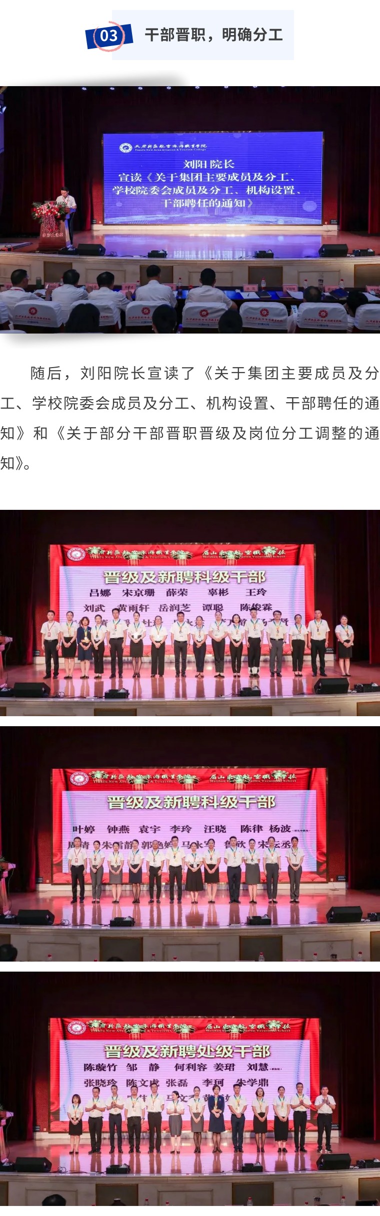 大会内容包含:学习新版《员工手册》修订内容;新员工风采展示;入职前培训优秀组长、学员表彰仪式;干部聘任名单宣读及干部晋职晋级表彰。