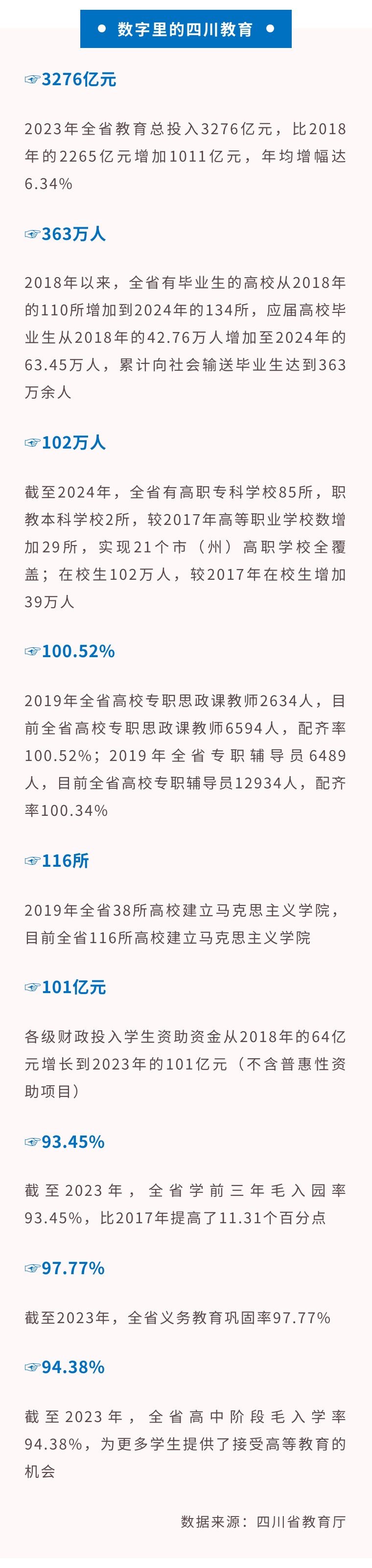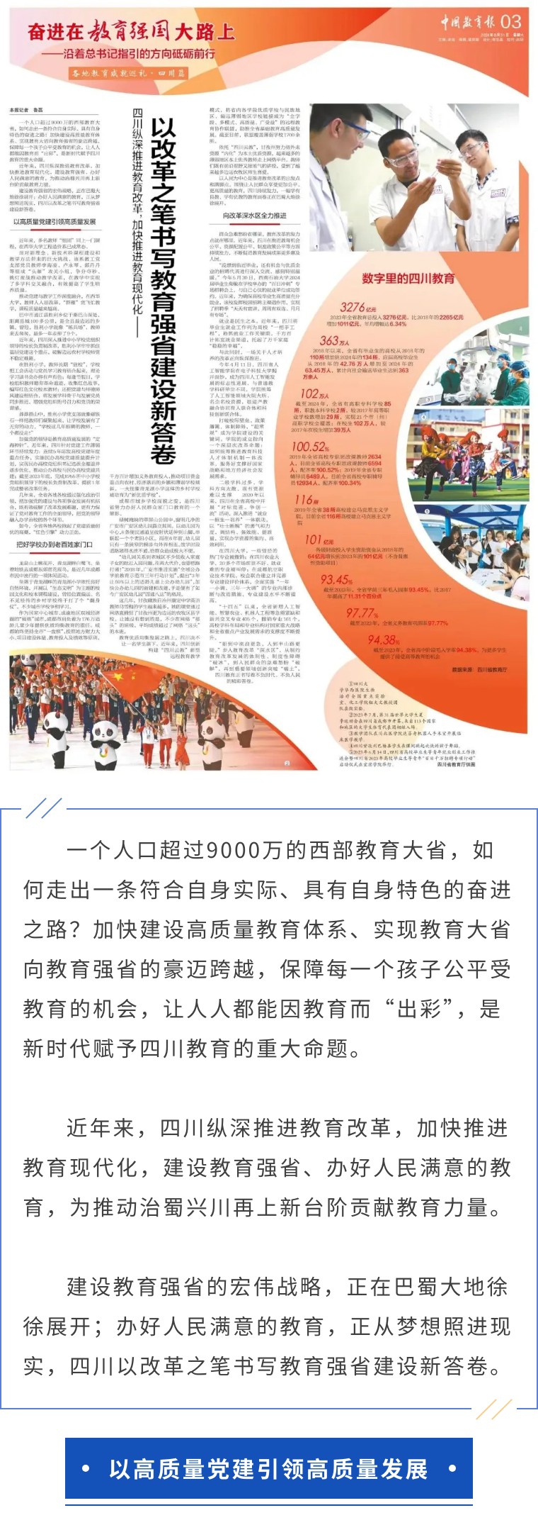 以人民为中心是推进教育改革的出发点和落脚点。围绕让人民群众享受更加公平、更高质量的教育,四川持续发力,一幅学有良教、学有优教的教育画卷正在巴蜀大地徐徐展开。