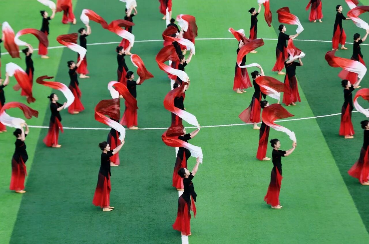 中场休息的哨声响起,同学们迅速转换角色,从观众席走向绿茵场。在全场观众的期待中,88名学子整齐列队,以饱满的精神状态准备献上精心准备的舞蹈《九州同》。随着《九州同》的恢弘乐声响起,学子们以整齐划一的动作、富有感染力的表演,将舞蹈中蕴含的民族团结精神和中华文化气韵展现得淋漓尽致。红衣翩翩,舞姿飒爽,在绿茵场上勾勒出一幅动人的画卷。舞蹈通过精心设计的队形变换和富有张力的艺术表现,展现了“九州同源、民族团结”的文化意境。他们的眼神坚定自信,笑容温暖灿烂,向万千观众诉说着九州同心的故事。