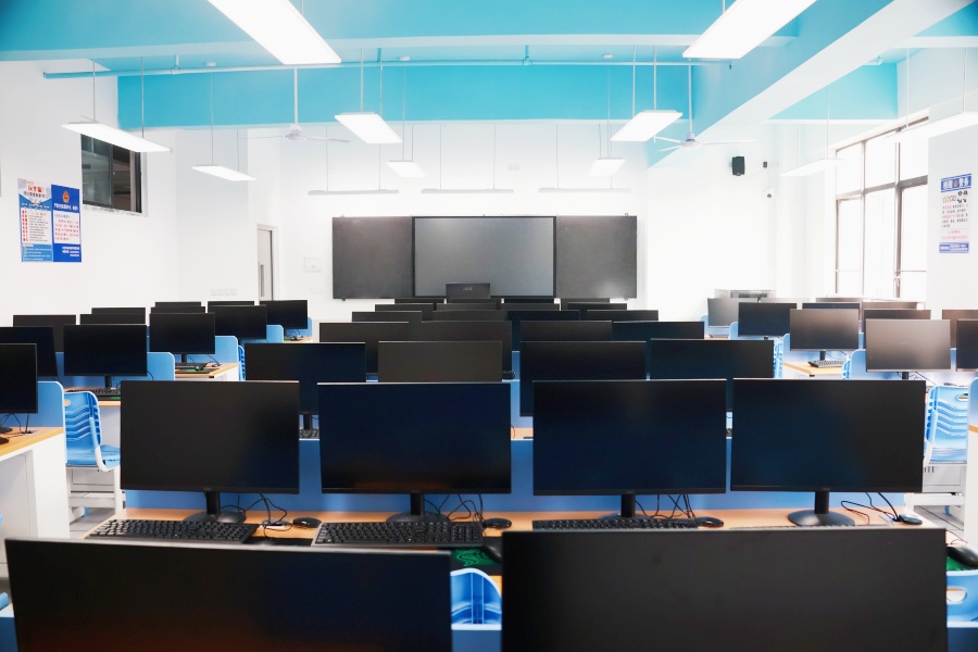 信息技术学院多功能媒体实训室,是集理论、模拟实训、多媒体演示于一体的现代化教学空间,专为信息技术相关专业人才培养量身打造。实训室配备高清交互式电版、专业音响设备,支持同学们实操演练的同时,同步理解课程的课件讲解。助力学生开展项目小组讨论、方案汇报等。此外,实训室内还接入校园智慧教学平台,实现教学资源共享。作为信息技术学院产教融合的重要教育教学阵地,为学校的人才培养提供高效、智能的教学支撑。