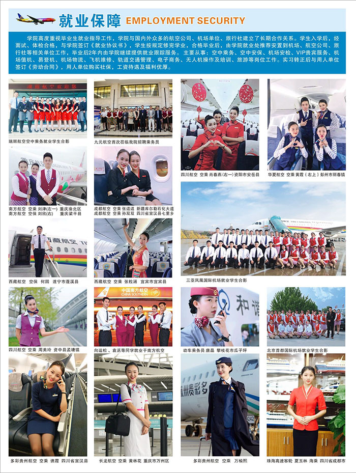 入学签订教育与就业协议书,合格毕业生全部安置到各大航空公司、机场工作,主要就业去向:中国国际航空公司,中国南方航空公司北京分公司,南方航空公司珠海分公司,多彩航空公司,瑞丽航空公司,华夏航空公司,厦门航空公司,东海航空公司,重庆空港贵宾服务公司,海南航空公司,东方航空四川分公司,四川航空公司,成都航空公司,西藏航空公司,上海吉祥航空公司,深圳飞鹤航空服务公司,昆明机场,腾冲机场,九黄机场,双流机场,珠海机场,重庆江北机场,绵阳机场,福州机场,贵阳机场,广东白云机场,深圳机场,上海浦东机场、温州机场,虹桥机场,北京首都机场,北京人民大会堂、成都铁路局、成都旅行社、重庆轻轨、四川省博物馆(事业单位)、各大型企业网站运营部、中信银行、招商银行、中国电信、中国移动等单位。