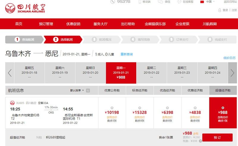 1月21日川航将开通乌鲁木齐=重庆=悉尼航线