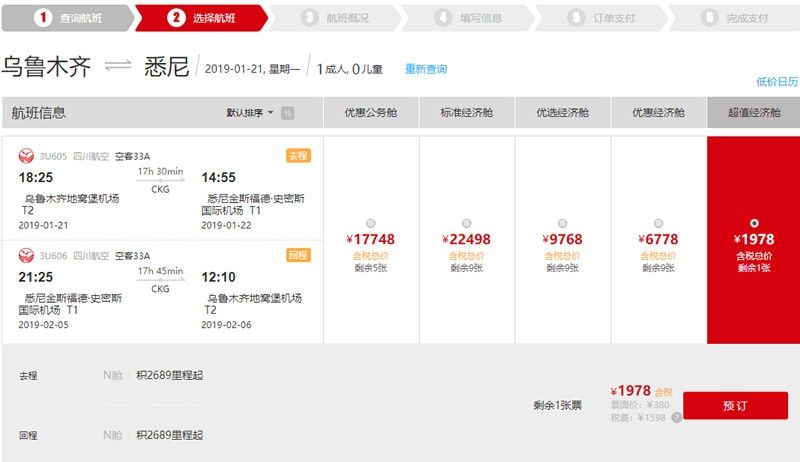 开航初期,川航特别推出乌鲁木齐始发特惠价格,现预订2019年1月21日至1月28日、2月11日至2月21日乌鲁木齐至悉尼航班单程300元人民币起,往返400元人民币起;预订2019年1月29日至2月10日乌鲁木齐至悉尼航班单程1000元人民币起,往返1200元人民币起。特惠价格数量有限,售完即止(以上价格未含税,乌鲁木齐至悉尼单程税费约700元人民币,往返税费约1600元人民币)。