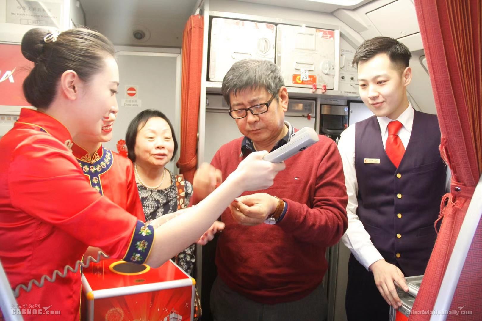 飞机进入平飞后,乘务员来到客舱里,向大家送出了元宵节的祝福,同时邀请了一名热情的旅客来到客舱中部,用随身携带的吉他为乘务员和旅客伴奏,一起唱响《我和我的祖国》,大家纷纷挥舞起手中的小红旗,客舱中洋溢着节日的喜悦。在随后的抽奖环节中,为展现天津特色,天津航空精心准备了泥人张。来自天津的旅客高先生幸运地抽中了泥人张,他说:“能坐上自己家乡主题的彩绘飞机感觉挺自豪的,这些礼物我们都很喜欢,希望家乡越来越好,越来越多的人能了解天津,来天津旅游!”