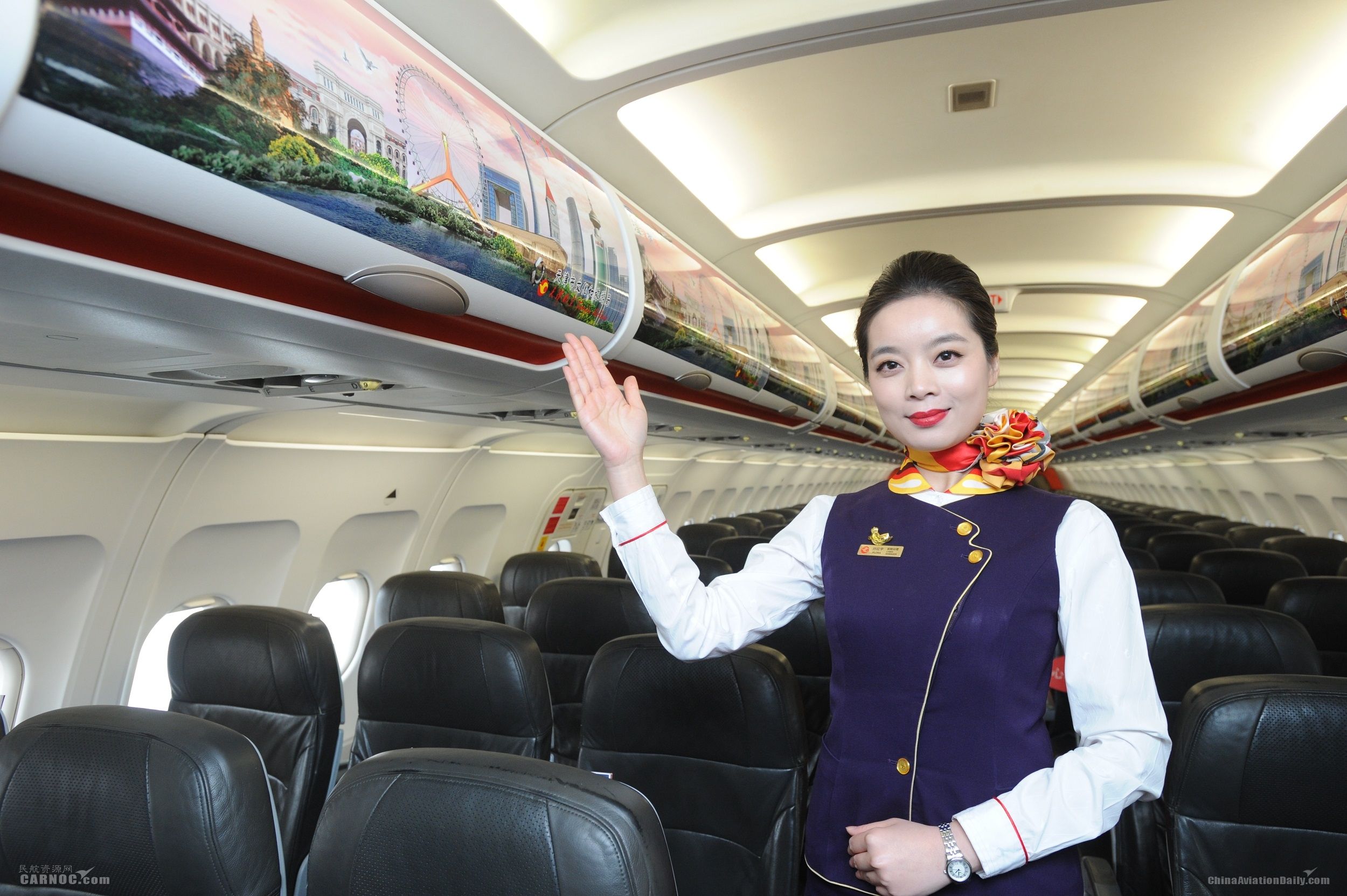乘务长孙婕通过广播向大家介绍了此次客舱活动以及机身涂装设计理念:“此架彩绘飞机的机身设计灵感来源于天津的地标性建筑--津门津塔和天津之眼,通过手绘的方式将上述景致错落排布。机身涂装还引入天津市行政区规划图、天津城市旅游宣传口号”天天乐道o津津有味“以及海河波浪等天津本地特色设计元素,配合天津旅游的红绿蓝三种品牌色彩,强化天津市旅游局的品牌属性,从而更好的推广天津旅游,传播天津文化。”