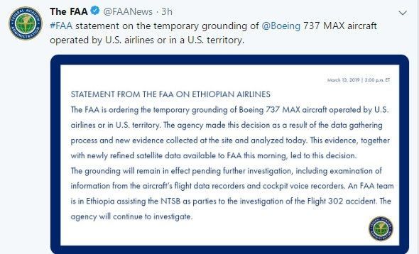 波音同样于当日发布了一份支持临时停飞737 MAX运营的声明。