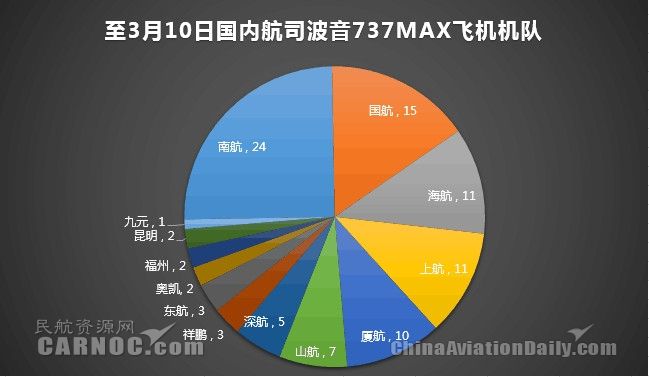 据民航资源网数据显示,中国国内共有13家航司运营着96架737 MAX飞机。按照民航局的要求,截至11日下午18时,国内运输航空公司均已暂停波音737MAX飞机商业运行。