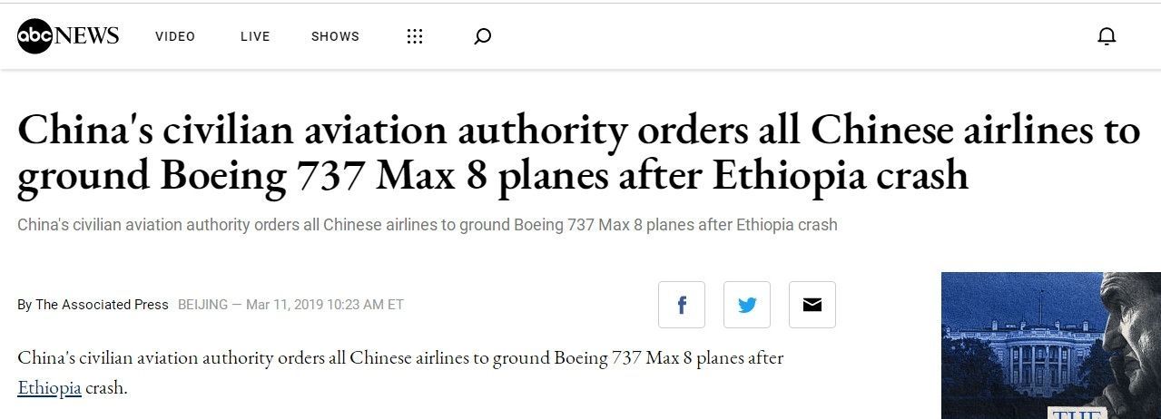 美国ABC报道——在埃塞俄比亚坠机事件之后,中国民航局命令所有中国航司停飞波音737 MAX 8飞机