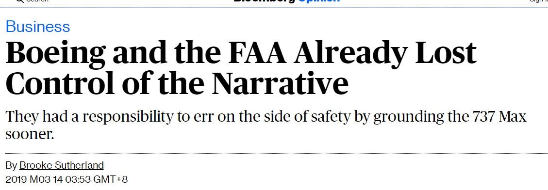 彭博社Brooke Sutherland发表评论文章称,波音与FAA已经丢失了话语权。波音与FAA本应早点采取更加保守的方式,但它们现在才以安全为先,这不能为它们之前的犹豫脱责。全球各国纷纷跟进领先者——中国,停飞737 MAX的做法,这损害了波音与FAA的可信度,并让它们在应对这一危机时处于被动防御地位。