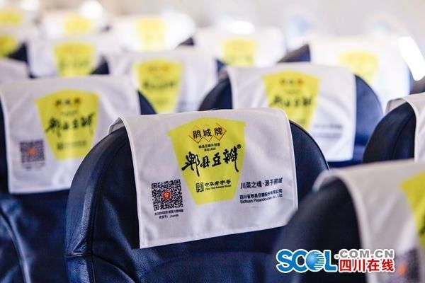 这是成都首张“美食文化空中名片”。“鹃城号”飞机机头、机身以及飞机侧面显著位置标示“郫县豆瓣”、“鹃城号”,及“川菜之魂、源自鹃城”字样。不仅外部涂装,内部也处处体现出品牌特点,“郫县豆瓣”元素随处可见,还有精美的宣传画面和视频展示等。今天的首飞之旅为乘客专门准备了首航定制的伴手礼,机上更是开展了趣味的郫县豆瓣知识问答游戏,让整个空中行程变得欢快、温馨。