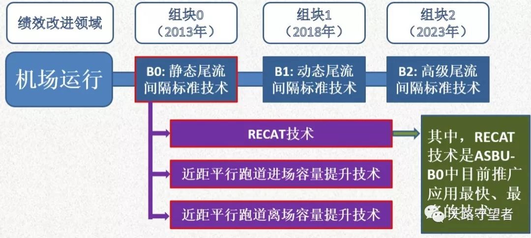 ICAO于2012年发布的ASBU机场运行引线中,给出了在三个组块/时间节点下的尾流间隔模块,明确提出了缩减尾流间隔的“三步走”计划,RECAT则是第一步(WAKE-B0)的重要组成部分。