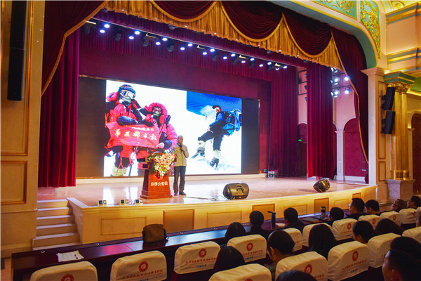 最吸引人的部分是刘建讲述自己攀登珠穆朗玛峰的亲身经历。刘建用幽默风趣的风格,讲述团队是如何在资金短缺的情况下找到赞助,如何在高压的环境下,像孤儿一样在漫天白雪中的攀登与等待。刘建心存祖国,为未能展露国旗留念而懊悔不已,也因此,同学们为之动容,掌声不断。