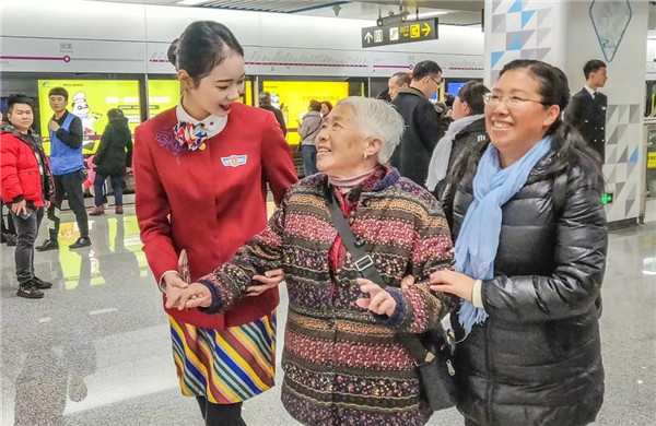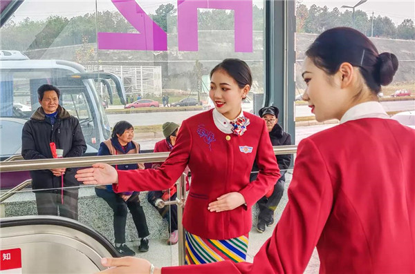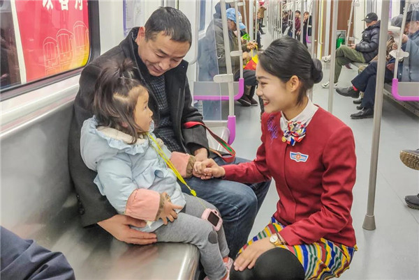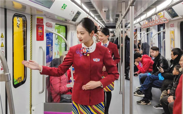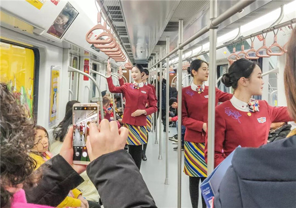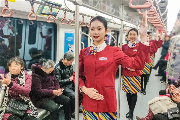 27日上午10时,在地铁5号线大厅以及抚琴、回龙站,一群身着空乘制服的颜值“空姐”给过往乘客报以甜甜的微笑,用她们标准的空乘礼仪动作给乘客进行乘车指引,并现场讲解乘车礼仪知识。随后,这群准空姐进入地铁车厢,跟乘客们互动,送上新年的问候和祝福。