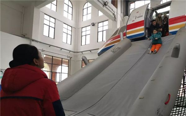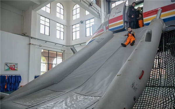 “起飞了,飞向蓝天了!”小朋友们在A320动态模拟舱内,感受真实飞机的起飞、颠簸和陆地、海上迫降等姿态。随后通过热身训练,在讲解员的示范中学会规范的逃生动作,掌握逃生姿势,进行高空紧急撤离体验。不少小朋友从滑梯滑下来的一刻喊道,“真是太刺激了,我还想再玩一次!”