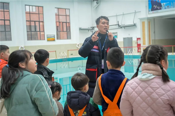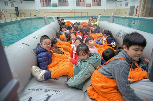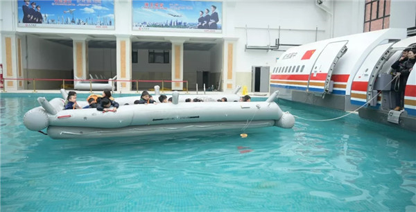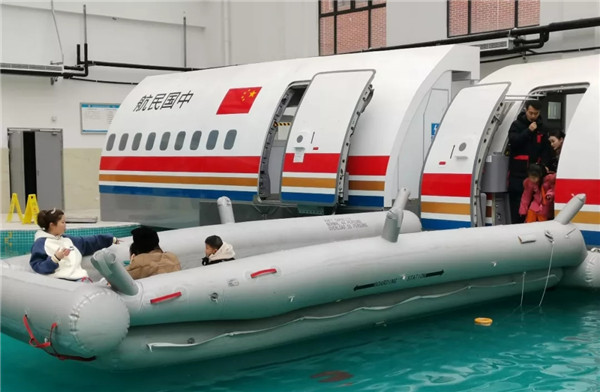 在水上训练室的A320/A330出口模拟器前,小朋友们在老师的指导下有序的从舱门撤离到水面救生艇上。实训中心老师为小朋友们讲解了飞机在水上迫降后的撤离技能、海上求生技巧、游泳技能等,通过理论和实操演示学习,培养小朋友一定的团结协作意识、求生意识和求生技能。