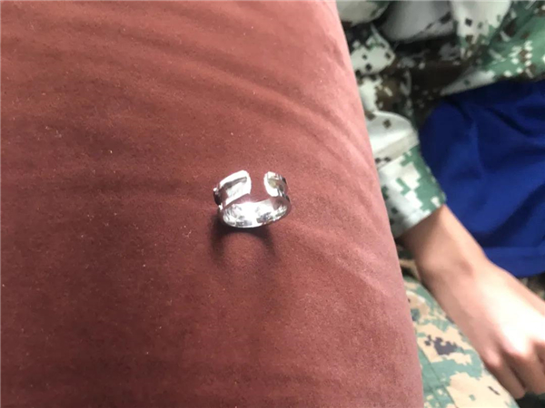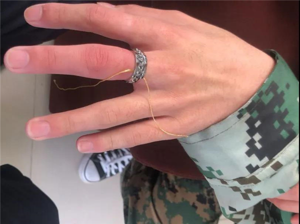 “没事,不用担心,我们保证给你取下来,你只需要放轻松,”代坤辉指导、蒙程班长、以及四名消防战士一边安慰何定倡同学,一边观察他的手指。消防官兵发现何定倡同学中指上戴着一枚银白色的戒指,由于长时间挤压,手指因血流不畅已出现肿胀现象。
