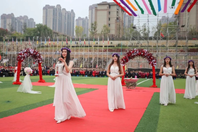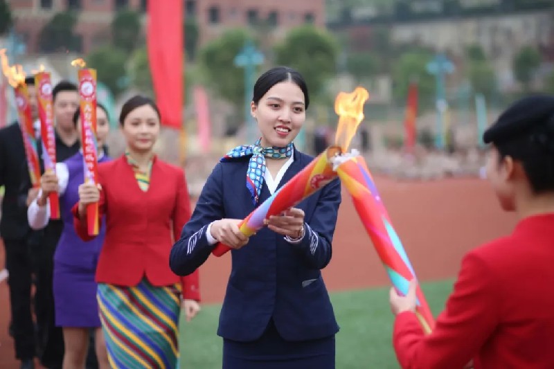 7名身着白色长裙,头戴花环的少女,面带微笑,提着火种缓缓走向足球场中央。学院在各大航空公司担任空姐、空哥和安检的毕业生代表,回到母校化身火炬手,将火炬传递给学院2020级新生代表,一起点燃火盆。这种薪火相传是母校学子爱的接力、希望与梦想的传递,是校友们与学弟学妹蓝天之梦的邀约。