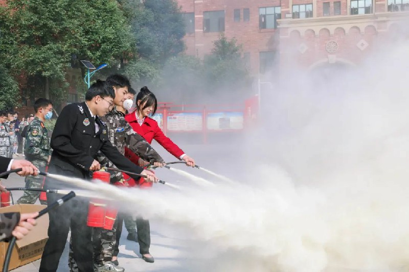 在对消防器材有初步的了解后,消防科老师组织进行消防灭火技能培训,学校师生、食堂工作人员现场示范如何正确使用灭火设备灭火。