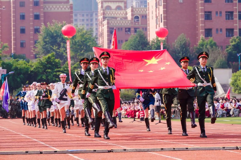 昂首阔步,英姿飒爽,国旗护卫队迈着铿锵有力的步伐缓缓走向旗台。鲜红的五星红旗在护旗手的双手中展开,在雄壮的国歌声中缓缓升起。旗帜迎风飘扬,所有人肃立,国旗到达顶端,典礼开启。