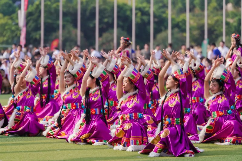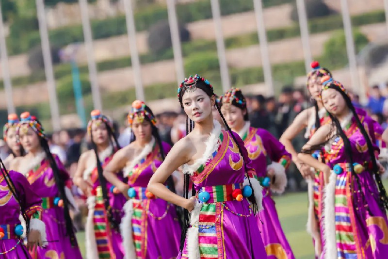 伴随着悠扬的藏族音乐,舞者们身着绚丽的民族服饰,轻盈地踏着节奏,仿佛将观众带入了青藏高原的辽阔天地。她们的动作时而柔美,时而铿锵,展现了藏族人民聚在一起时的欢乐与豪情。舞台上的色彩与韵律交织,欢快的气氛瞬间感染了全场,观众仿佛也被这欢乐的场景所感染,心随舞动。
